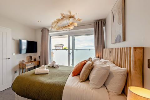 Sliding patio doors lead to the balcony where you can enjoy fantastic sea views and sit back and relax in your own private hot tub.